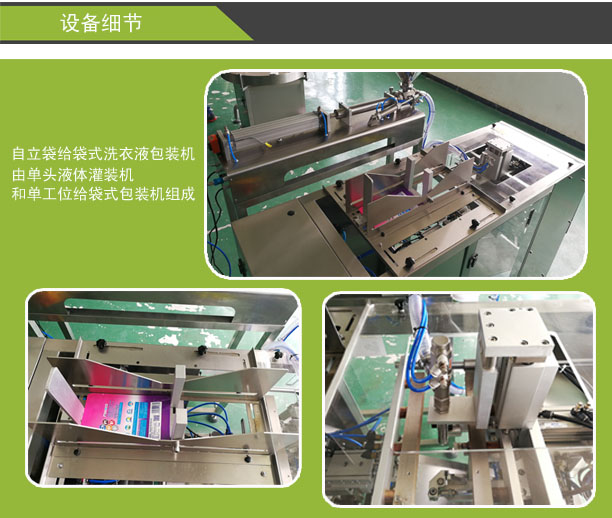 全自動自立袋洗衣液灌裝機(jī)是星火新研發(fā)的一款產(chǎn)品,上袋、定量灌裝、封合、切膜、自動計(jì)數(shù)一次性自動完成,工藝流程部位采用不銹鋼制造,包裝袋熱合、送袋長度、包裝重量、加熱溫度的調(diào)整,簡便可靠,連續(xù)灌裝精度高,包裝速度快,維修方便,是用戶致富選擇的理想設(shè)備。包裝產(chǎn)品美觀牢靠,外殼、管道、定量泵采用不銹鋼結(jié)構(gòu),確保衛(wèi)生,符合食品衛(wèi)生的要求