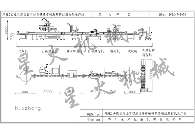 理瓶2頭灌裝真空旋蓋貼標(biāo)噴碼收瓶及開(kāi)箱封箱打包生產(chǎn)線
