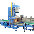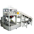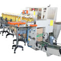 袋裝全自動裝箱機開箱機預先開始工作,將紙箱開箱成型,同時膠帶粘貼到紙箱..