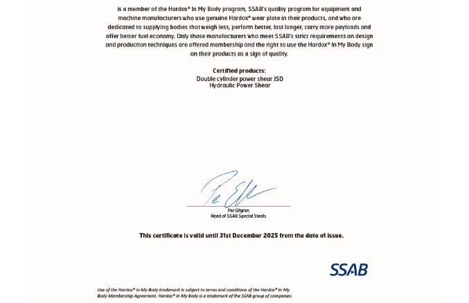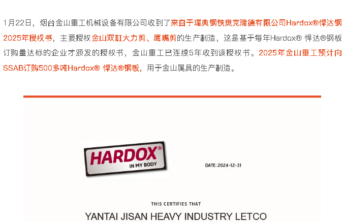金山重工連續(xù)五年受瑞典鋼鐵奧克隆德有限公司Hardox?悍達(dá)鋼授權(quán)