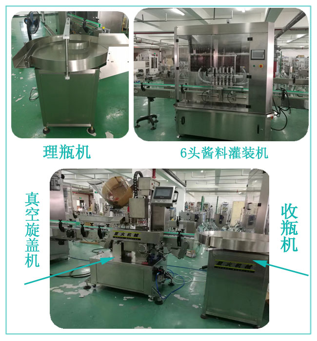 醬料灌裝生產線-全自動辣椒醬灌裝真空旋蓋生產線 采用活塞定量,集機電、氣動于一體,電器和氣動元件選用世界知名品牌。設計合理,結構緊湊,外形美觀,具有性能穩(wěn)定可靠、灌裝精度高、適應性強、操作簡單、維護方便等特點。該生產線由理瓶機、六頭醬料灌裝機、全自動真空旋蓋機、收瓶機組成